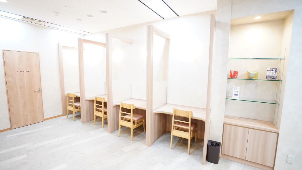 仕切りでプライバシーが保たれる待合室。それぞれの席にコンセントも完備している。