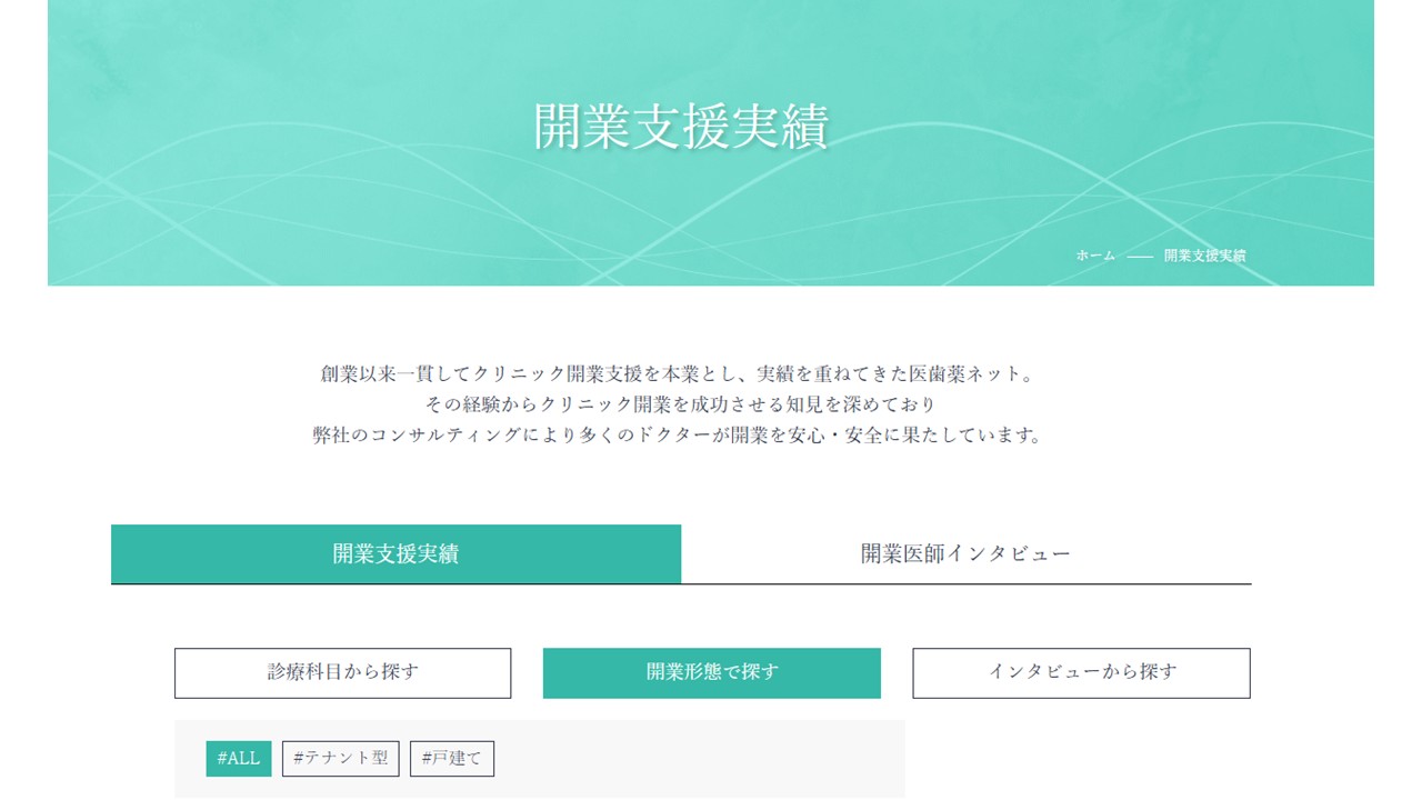 弊社HPの開業支援実績では、物件形態ごとにクリニックを表示することも可能です。